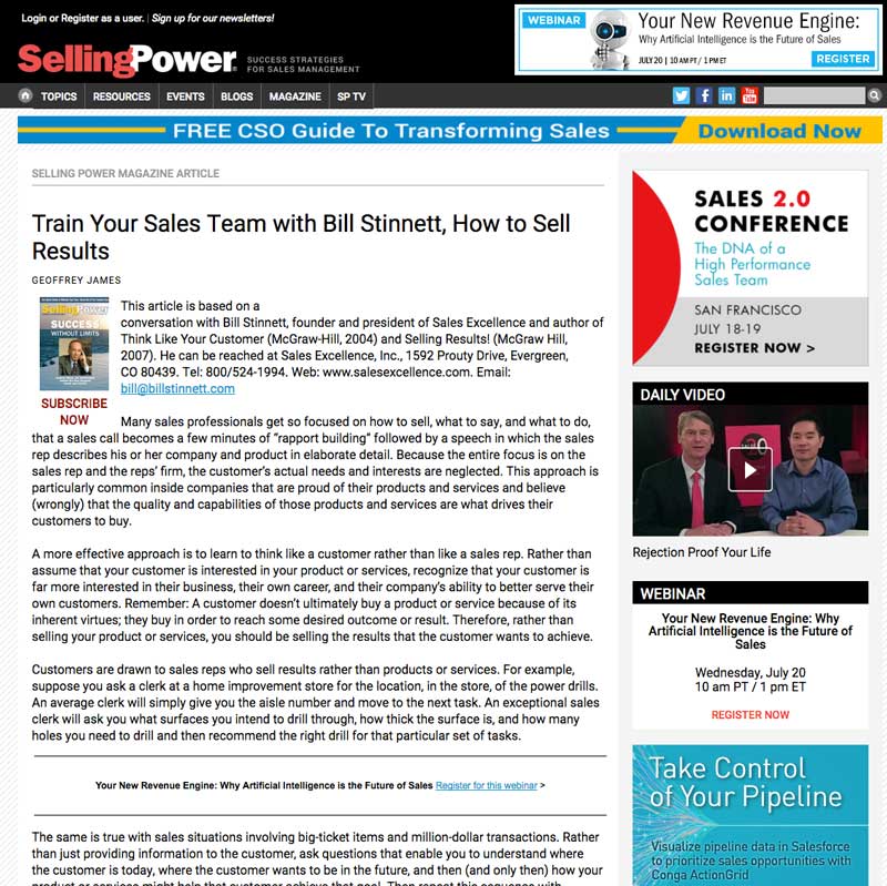 This article, published in Selling Power, is based on a conversation with Bill Stinnett, founder and president of Sales Excellence and author of Think Like Your Customer (McGraw-Hill, 2004) and Selling Results! (McGraw Hill, 2007).